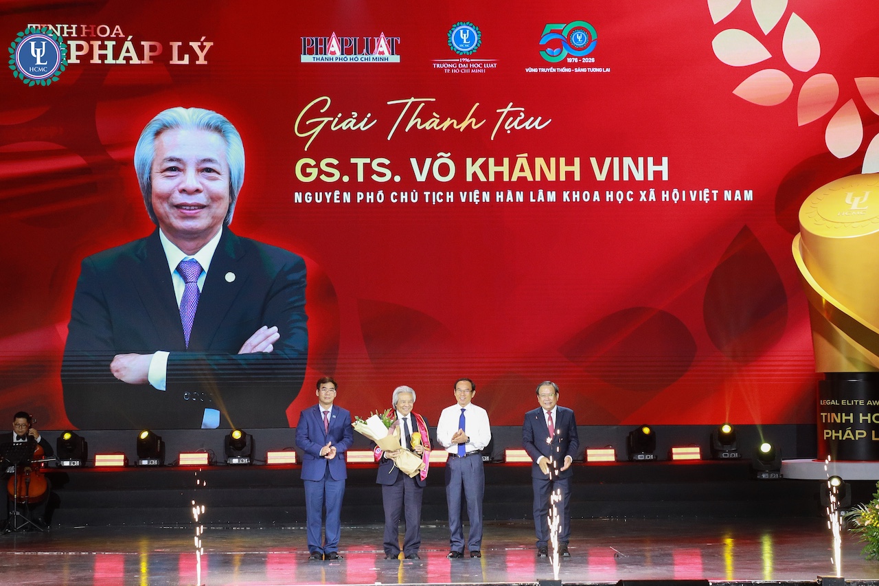 Ông Nguyễn Văn Nên – nguyên Ủy viên Bộ Chính trị, nguyên Bí thư Thành ủy TP.HCM; Nhà báo Mai Ngọc Phước, Tổng Biên tập Báo Pháp luật TP.HCM và TS. Lê Trường Sơn – Hiệu trưởng Trường Đại học Luật TP.HCM trao tặng cúp, sash và hoa cho GS.TS. Võ Khánh Vinh
