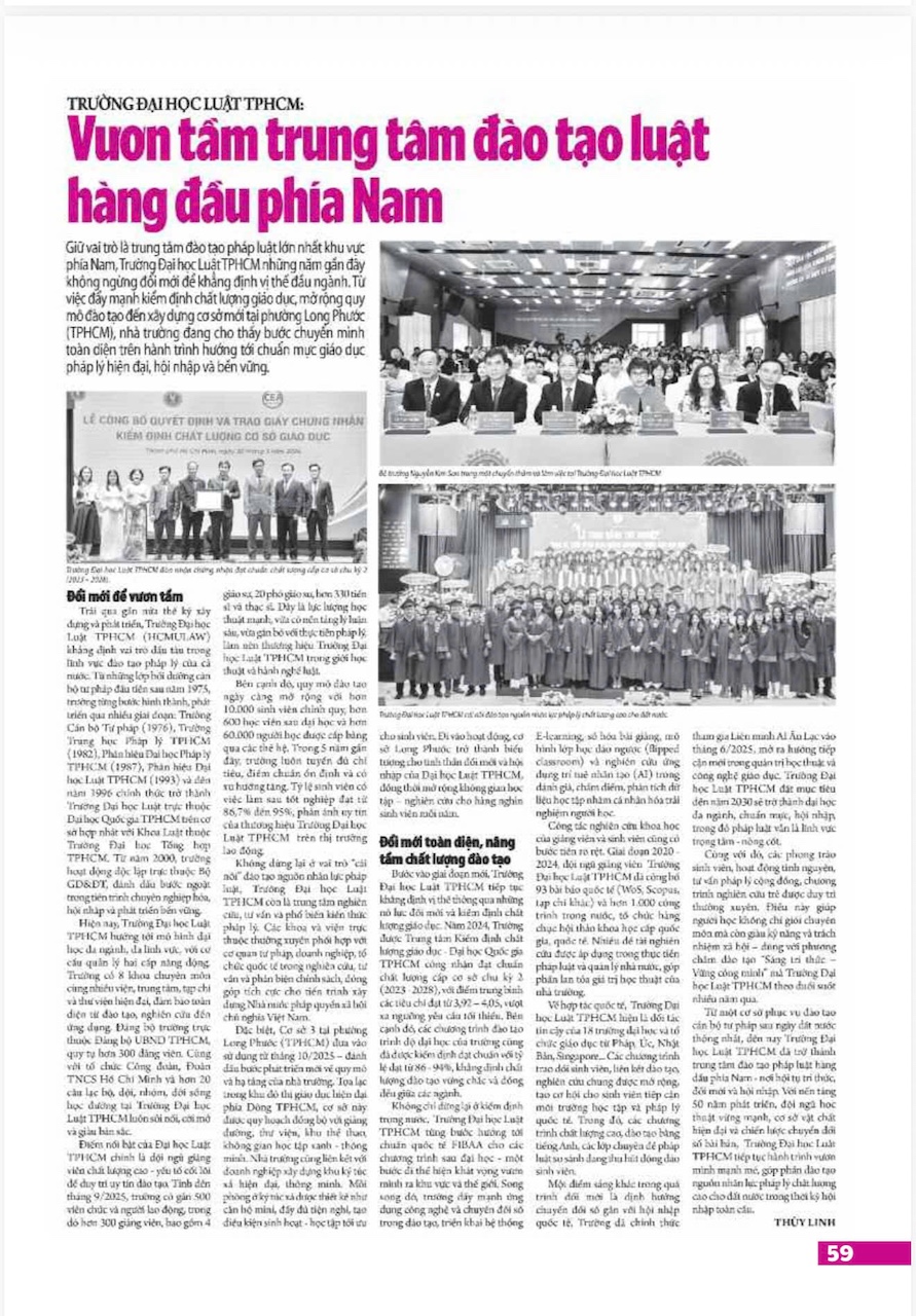 Nhân kỷ niệm Ngày Nhà giáo Việt Nam 20/11/2025, Báo Giáo dục và Thời đại đã có bài viết về Trường Đại học Luật TP.HCM, ghi nhận chặng đường đổi mới, phát triển bền bỉ của Nhà trường trong vai trò trung tâm đào tạo pháp luật hàng đầu khu vực phía Nam, từng bước khẳng định vị thế đầu ngành, hướng tới chuẩn mực giáo dục pháp lý hiện đại, hội nhập và bền vững.