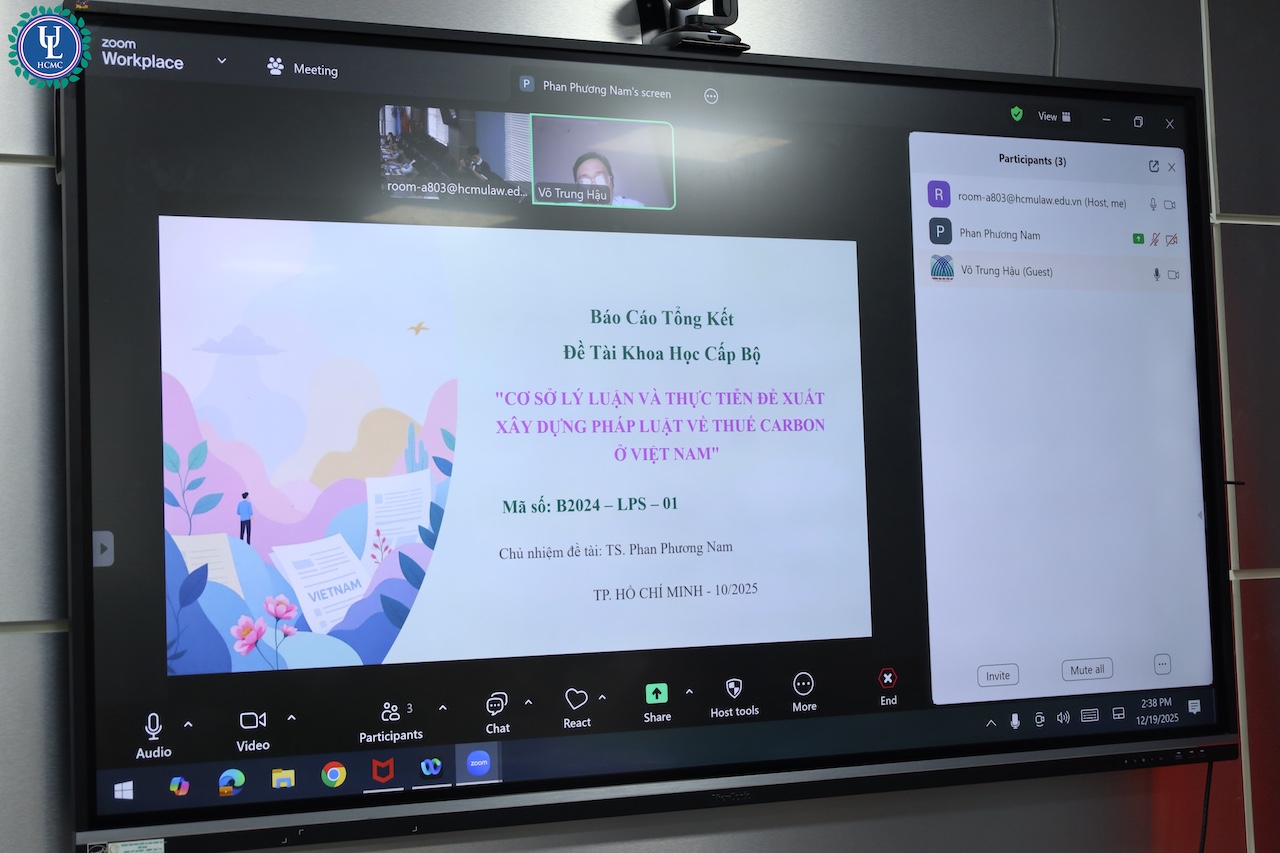 Vào chiều ngày 19.12.2025, Trường Đại học Luật TP. Hồ Chí Minh đã tổ chức họp nghiệm thu cấp cơ sở đối với đề tài Nghiên cứu khoa học: “Cơ sở lý luận và thực tiễn đề xuất xây dựng pháp luật về thuế carbon ở Việt Nam” do TS. Phan Phương Nam làm chủ nhiệm nhằm đánh giá kết quả nghiên cứu, mức độ hoàn thành và chất lượng khoa học của đề tài đồng thời xem xét tính khả thi của các đề xuất xây dựng pháp luật về thuế carbon ở Việt Nam.