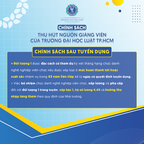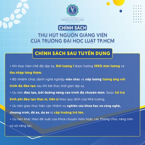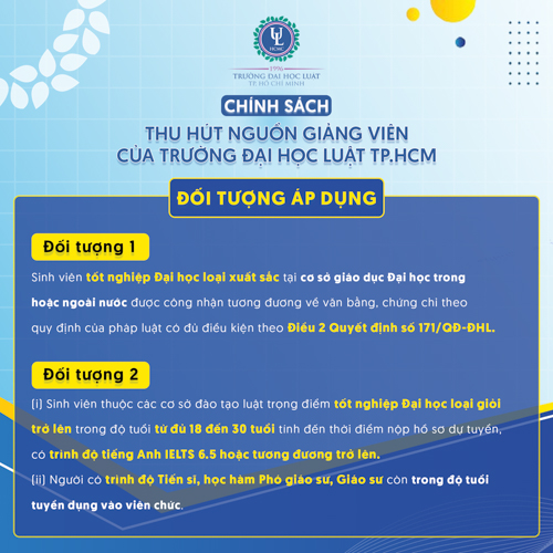 Với mục tiêu thực hiện thành công đề án xây dựng Trường ĐH Luật TP.HCM thành trường trọng điểm đào tạo cán bộ pháp luật theo Quyết định số 1156/QĐ-TTG ngày 30/9/2022 về kế hoạch chiến lược phát triển trường đến năm 2030 tầm nhìn đến năm 2045, Trường ĐH Luật TP.HCM đã ban hành quy định về chính sách thu hút tại nguồn giảng viên từ sinh viên tốt nghiệp xuất sắc người có học hàm học vị cao để bổ sung đội ngũ giảng viên nâng cao chất lượng đào tạo.