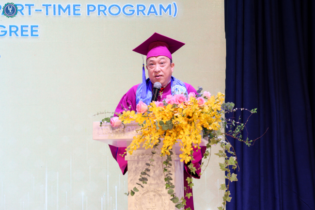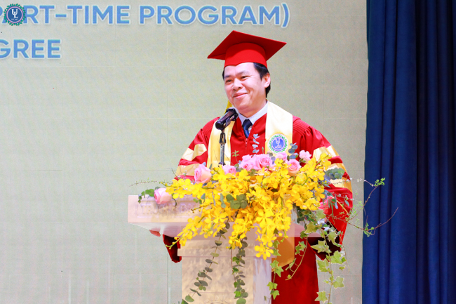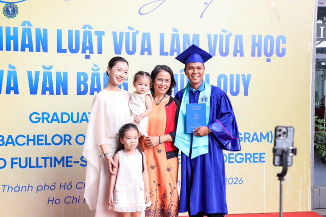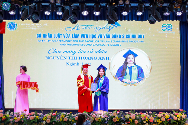 Đại diện toàn thế các tân cử nhân, sinh viên Nguyễn Hữu Khoa - Lớp trưởng lớp 14B Văn bằng 2 Chính quy, một trong hai sinh viên tốt nghiệp loại Xuất Sắc đã gửi lời tri ân chân thành đến Nhà trường và các quý thầy cô giảng viên. Chia sẻ lại buổi lễ, anh Nguyễn Hữu Khoa nhấn mạnh các anh chị sinh viên dù đến với Nhà trường với những xuất phát điểm khác nhau, nhưng lại là những người cùng nhau học tập, đồng hành dưới ngôi nhà Ulaw bằng tinh thần cầu tiến và khát vọng tri thức. Theo đó, quãng thời gian học tập tại trường đã trở thành những ký ức tươi đẹp, khó quên của tuổi trẻ. Chính nhờ những trải nghiệm ấy đã góp phần tôi luyện cho các anh chị sinh viên bản lĩnh, tinh thần trách nhiệm và ý thức cống hiến, sẵn sàng lan tỏa những giá trị tốt đẹp cho xã hội, cộng đồng. Lễ tốt nghiệp không chỉ là sự ghi nhận cho những nỗ lực bền bỉ của sinh viên trong suốt hành trình học tập, mà còn là minh chứng cho niềm tin, tâm huyết và sự dẫn dắt tận tâm của thầy cô – những người đã âm thầm gieo vào lòng sinh viên tinh thần thượng tôn pháp luật và trách nhiệm của người làm luật trong tương lai.