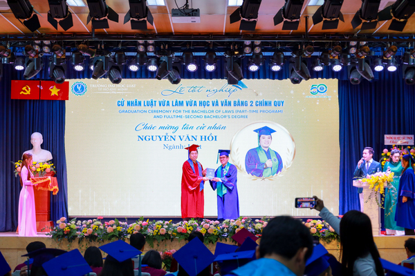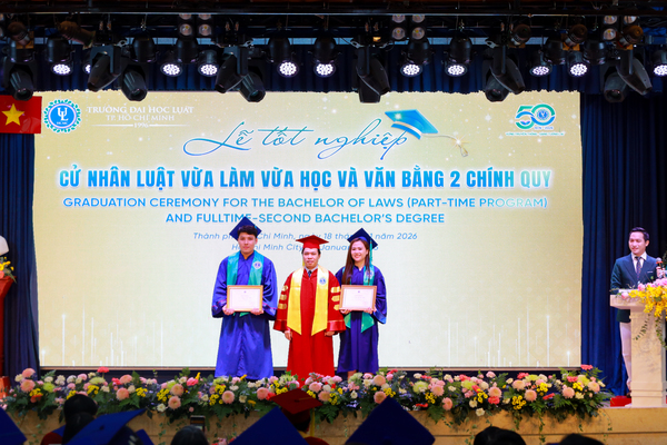 Sáng ngày 18/1/2026, tại Hội trường C.302, cơ sở Nguyễn Tất Thành, Trường Đại học Luật TP. HCM đã long trọng tổ chức Lễ tốt nghiệp và trao bằng Cử nhân cho sinh viên trình độ đại học hình thức đào tạo chính quy (văn bằng 2) và vừa làm vừa học.