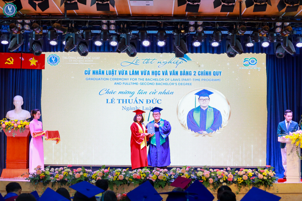 Tiếp nối buổi lễ, GS.TS. Đỗ Văn Đại - Phó Hiệu trưởng Nhà trường cho biết buổi lễ tốt nghiệp không chỉ là một sự kiện trang trọng mà còn là cột mốc đặc biệt, đánh dấu hành trình bền bỉ của tri thức, nỗ lực và khát vọng của các tân cử nhân, đồng thời gửi lời chúc mừng tốt nghiệp đến các tân cử nhân - những người đã không ngừng cố gắng, kiên trì vượt qua chặng đường học tập đầy thử thách để có được ngày hôm nay. Thay mặt Ban lãnh đạo Nhà trường, GS.TS. Đỗ Văn Đại gửi lời cảm ơn sâu sắc đến các anh chị học viên đã tin tưởng lựa chọn Trường Đại học Luật TP. HCM làm nơi gửi gắm tri thức. Khép lại hành trình dài học tập tại giảng đường, Nhà trường hy vọng các tân cử nhân sẽ mang theo hành trang kiến thức, bản lĩnh và trách nhiệm xã hội để cống hiến những giá trị tốt đẹp cho xã hội và luôn lan tỏa tinh thần học tập, nhiệt huyết tuổi trẻ đến các thế hệ sinh viên.