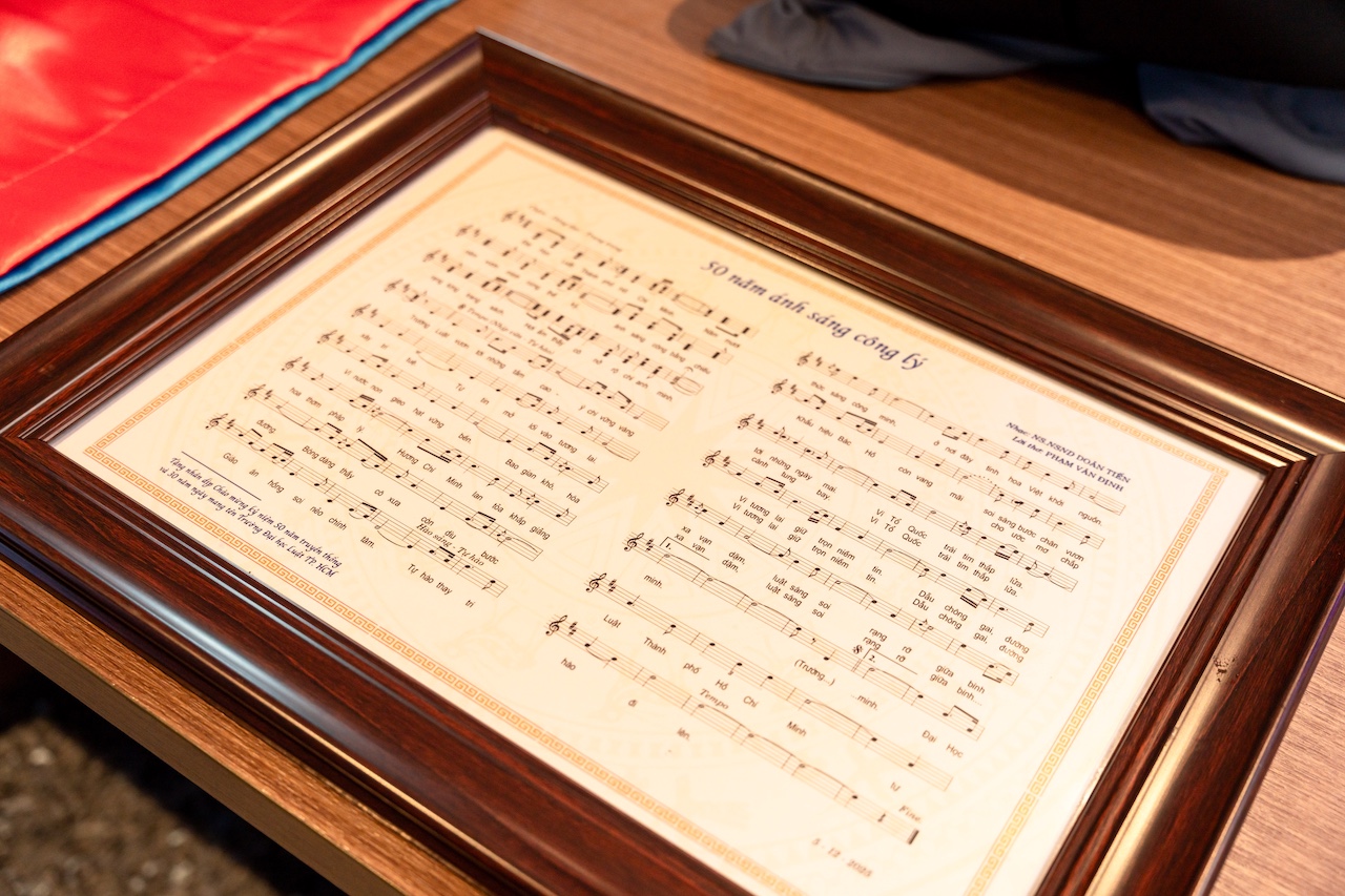 Another special moment was the presentation of a commemorative song celebrating the University’s 50-year legacy. At the event, Mr. Phạm Văn Định – former Head of the Dormitory Management Division, Office of Political and Student Affairs, solemnly presented the song “50 Years of the Light of Justice” as a heartfelt spiritual gift. The composition embodied deep affection, gratitude, and pride of a ULAW alumnus for his alma mater, conveying aspirations for justice, faith, and inspiration for generations of ULAW staff, lecturers, and students.